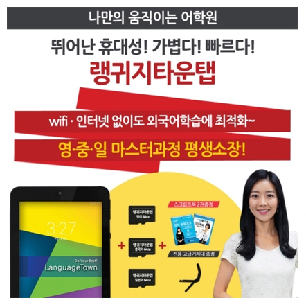 국내 최대 17개 외국어의 인강을 제작 및 서비스하는 랭귀지타운에서 영어와 중국어, 일본어를 평생동안 소장하며 공부할 수 있는 '랭귀지타운탭' 상품을 출시하여 화제를 모으고 있다.